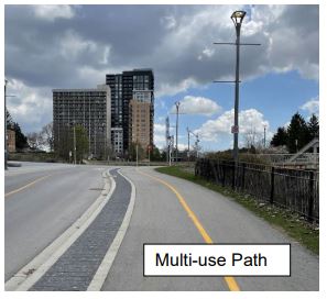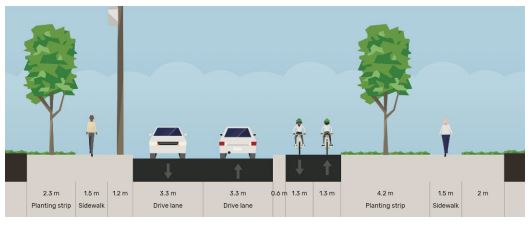 This project has specific sections where the city-owned right-of-way is constrained and a multi-use path would be the best fit, instead of cycle tracks and sidewalk. We are seeking community feedback about implementing a multi-use path as the preferred solution in specific locations along the corridor. This project aligns with the City of London’s “Complete Streets” approach to street design, which aims to balance the needs of all road users with an emphasis on road safety. Reallocating existing road space used for on-street parking allows for the addition of safe and comfortable cycling facilities to a busy residential corridor and forms an important connection to the Thames Valley Parkway path system. An example of the updated road configuration is illustrated in the rendering below.