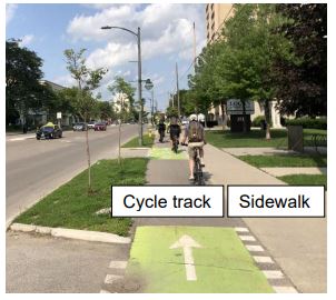 Above: A one-way cycle track beside a sidewalk on Dundas Street