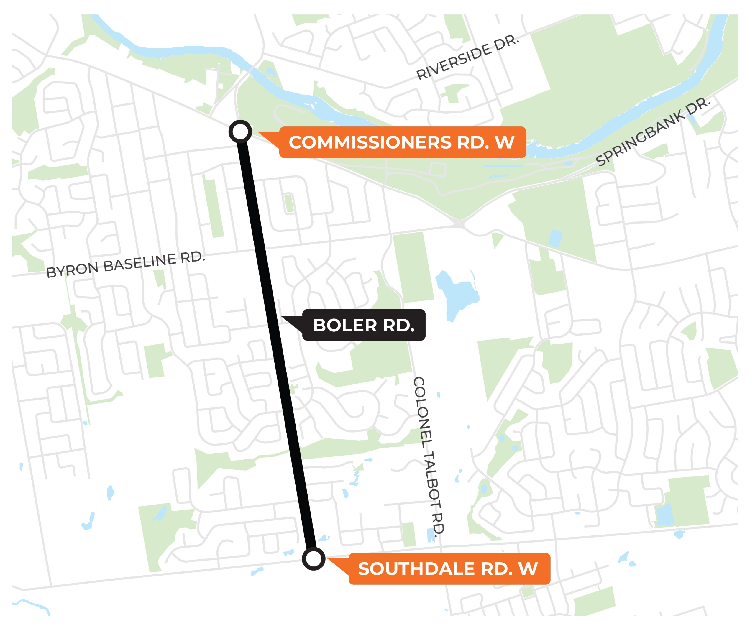 The City is proposing cycling improvements to Boler Road between Southdale Road West and Commissioners Road West. This project will provide a link between existing cycling facilities on Southdale Road West, Byron Baseline Road, and the Thames Valley Parkway in Springbank Park.