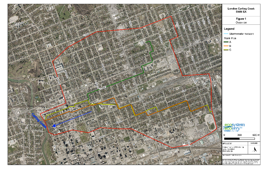 The City of London has retained the services of Matrix Solutions Inc. (formerly Ecosystem Recovery Inc.) to undertake a Municipal Class Stormwater Management Master Plan and Environmental Assessment (MCEA) study for the Carling Creek subwatershed. The objective of the Carling Creek Stormwater Management Master Plan study is to develop a comprehensive long-term stormwater management strategy that addresses stormwater servicing deficiencies, surface flooding, and infrastructure renewal for existing and future land use within the area described as the ‘Core’ of the City of London. Long-term considerations include evaluating alternative options for strategic infrastructure upgrades, implementation of regional stormwater management systems, and the application of Low Impact Development (LID) solutions to achieve the desired level of stormwater servicing within the ‘Core’ study area. The stormwater management alternatives developed as part of the study will be evaluated based on level of service expectations, constructability, cost, environmental impacts, and adaptability to climate change.