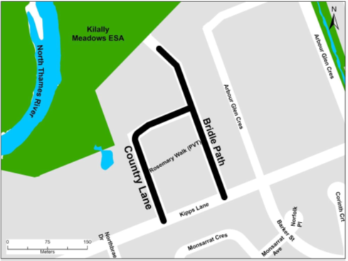 The City has evaluated how pedestrians, motorists, and cyclists will be impacted by the construction of this project. We have determined Country Lane and Bridle Path will remain open to local vehicle traffic only. There may be a few possible disruptions to parking lot access at different points in the project. Residents who require accommodation (level entry, advanced notice, etc.) should contact the Project Manager to arrange for access during the construction period. Cyclists and pedestrians should exercise caution around construction sites and follow all construction signs. A Construction Notice will be issued before construction begins with additional information.