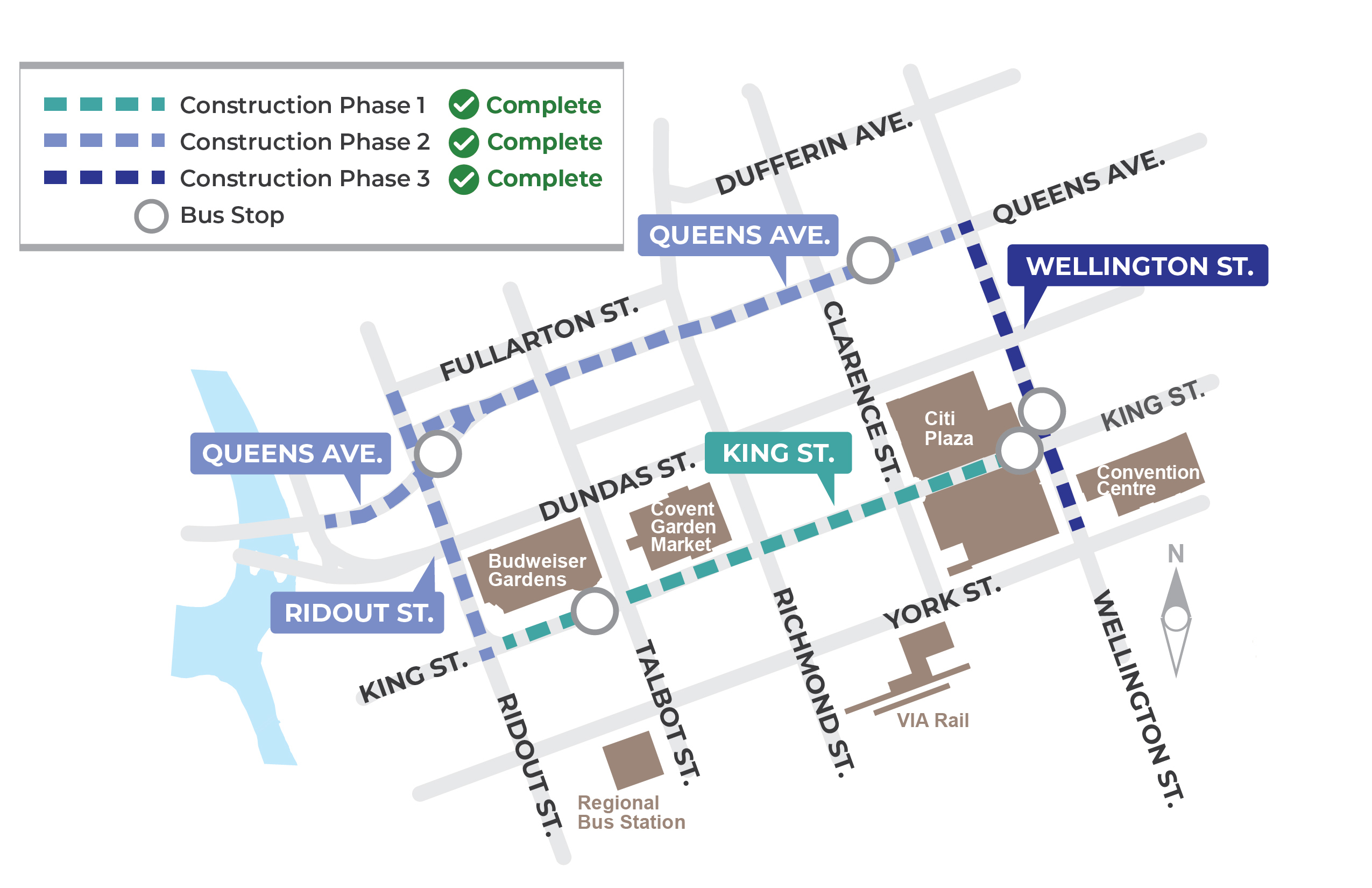 Phase 3 of the Downtown Loop construction began in April 2023 on Wellington Street between Queens Avenue and York Street.