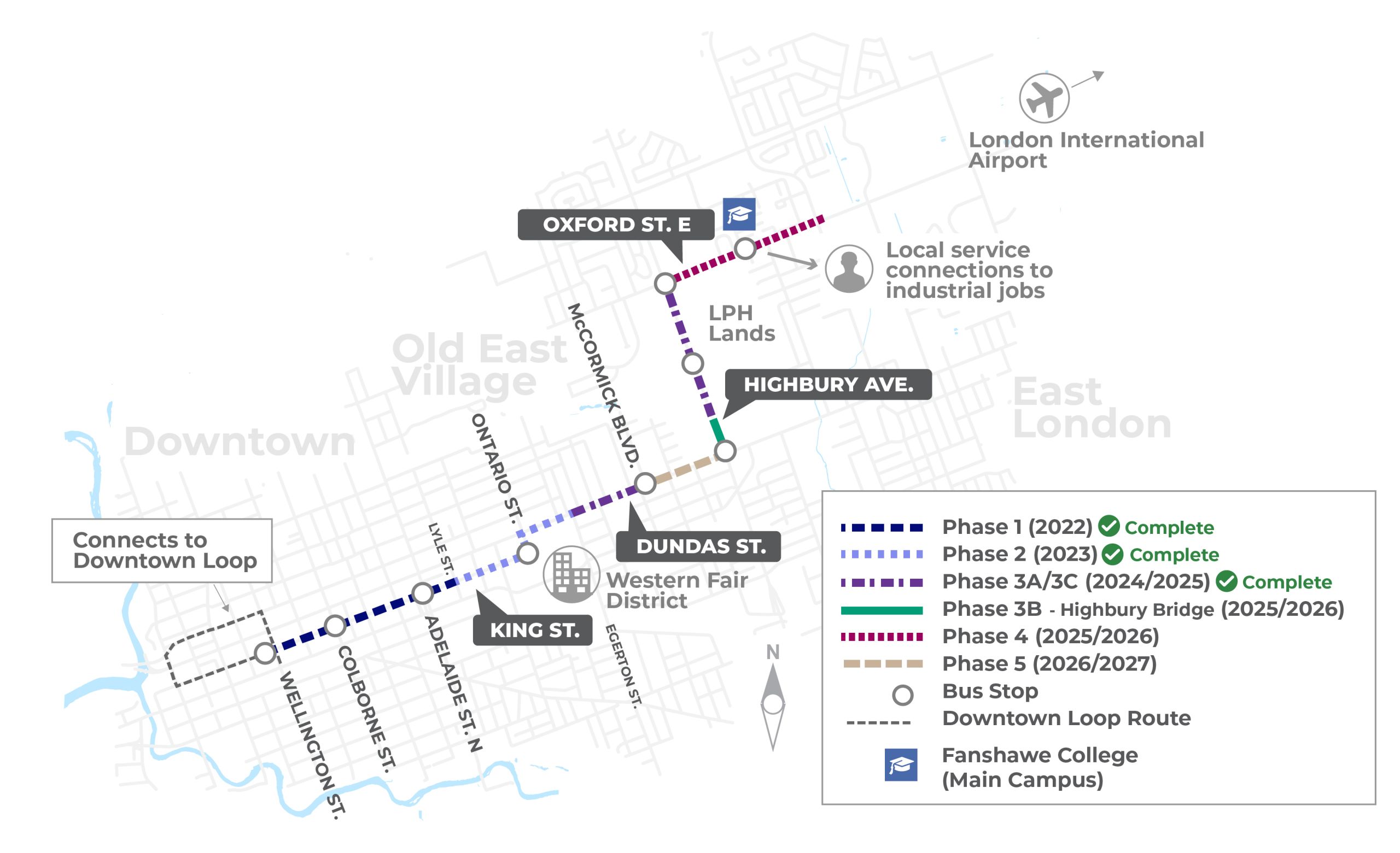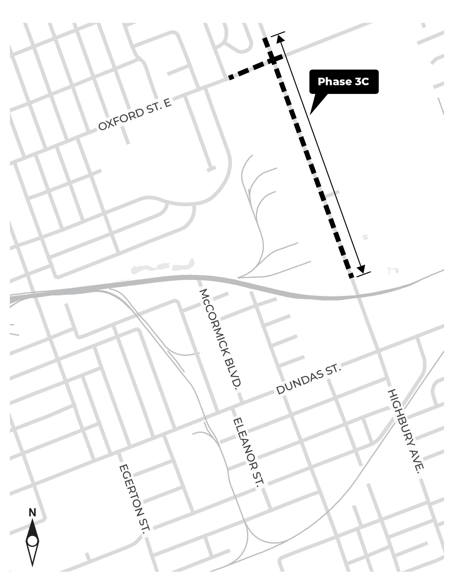 Phase 3C – Oxford to Highbury: Most construction will wrap up in 2025, with final paving and bus lane painting planned for spring/summer 2026.