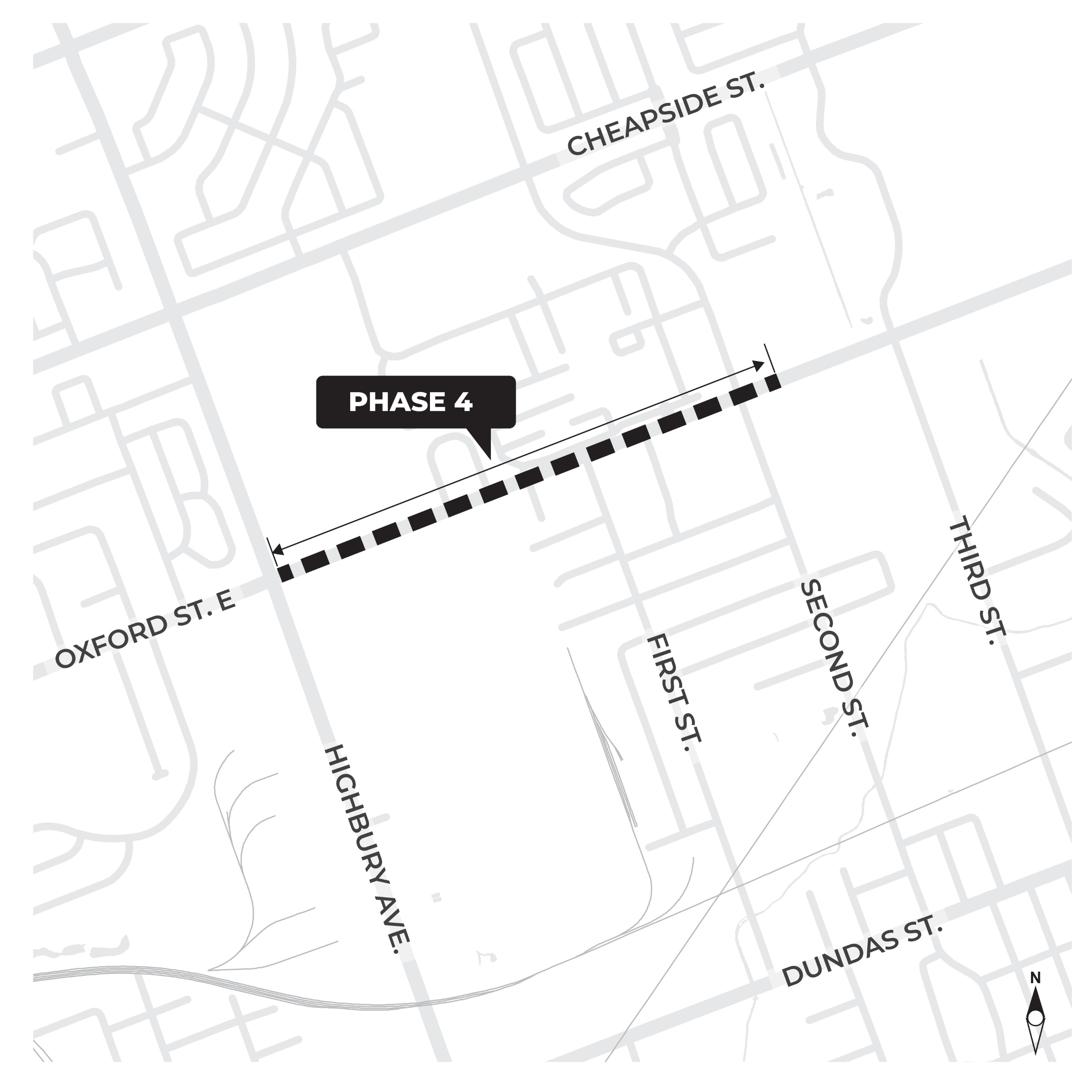 Phase 4 – Oxford Street: Crews are completing roadwork, sidewalks and landscaping on the south side of Oxford Street this year. Work on the north side, between Highbury Avenue and Second Street, is scheduled to begin in January 2026. Lane restrictions and detours will be in place through September 2026.