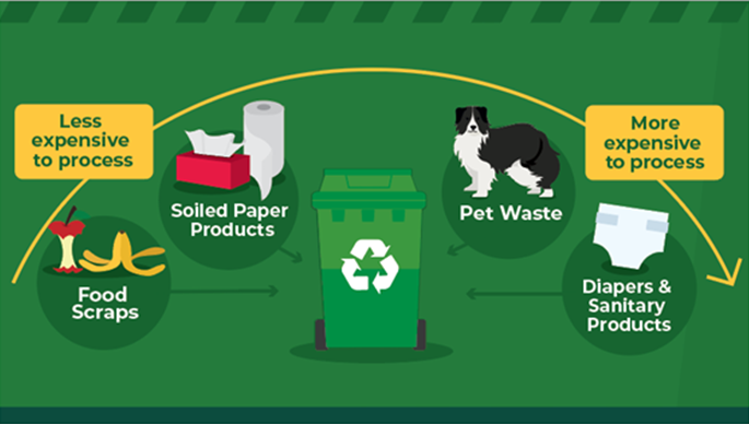 Including pet waste and diapers/sanitary products could increase processing costs by between 20% and 40%. Diversion through the Green Bin could increase by between 15% and 25%. It is important to note that the diaper/sanitary products are not composted or digested; therefore, they still end up in the landfill. Depending on the type of pre-processing system used, many dog waste bags may not open and not expose the contents for further processing.