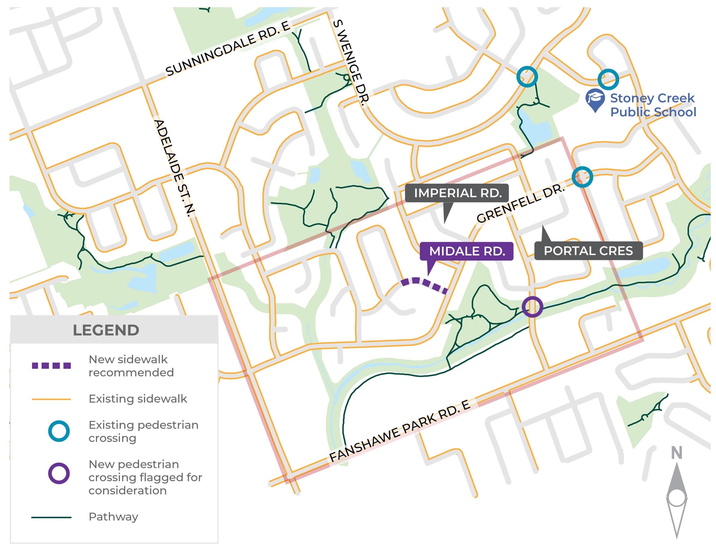 Above: Map graphic showing recommended new sidewalk connections for the Grenfell area