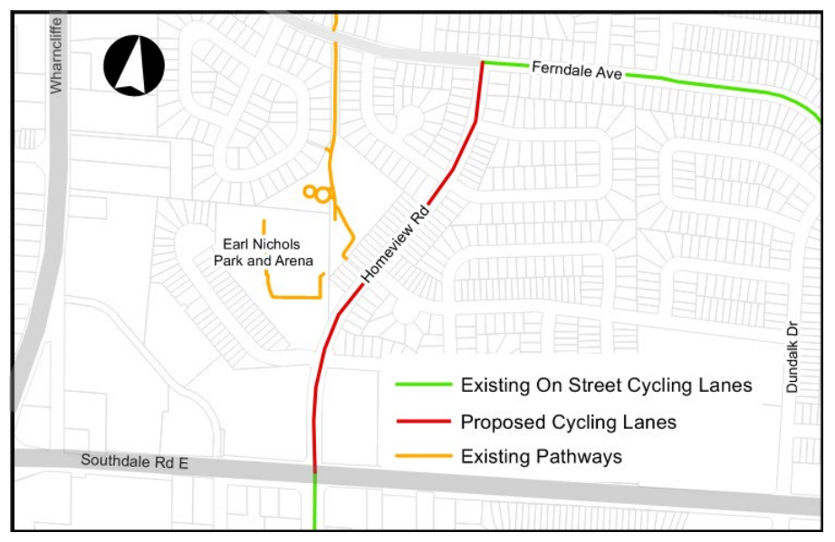 The City of London is adding cycling improvements to Homeview Rd between Ferndale Avenue and Southdale Road East, with implementation tentatively scheduled for 2025. This project will improve safety for people riding bikes and fill a gap in the cycling network between the existing White Oak Road bike lanes to the south and the existing Ferndale Ave bike lanes to the east.