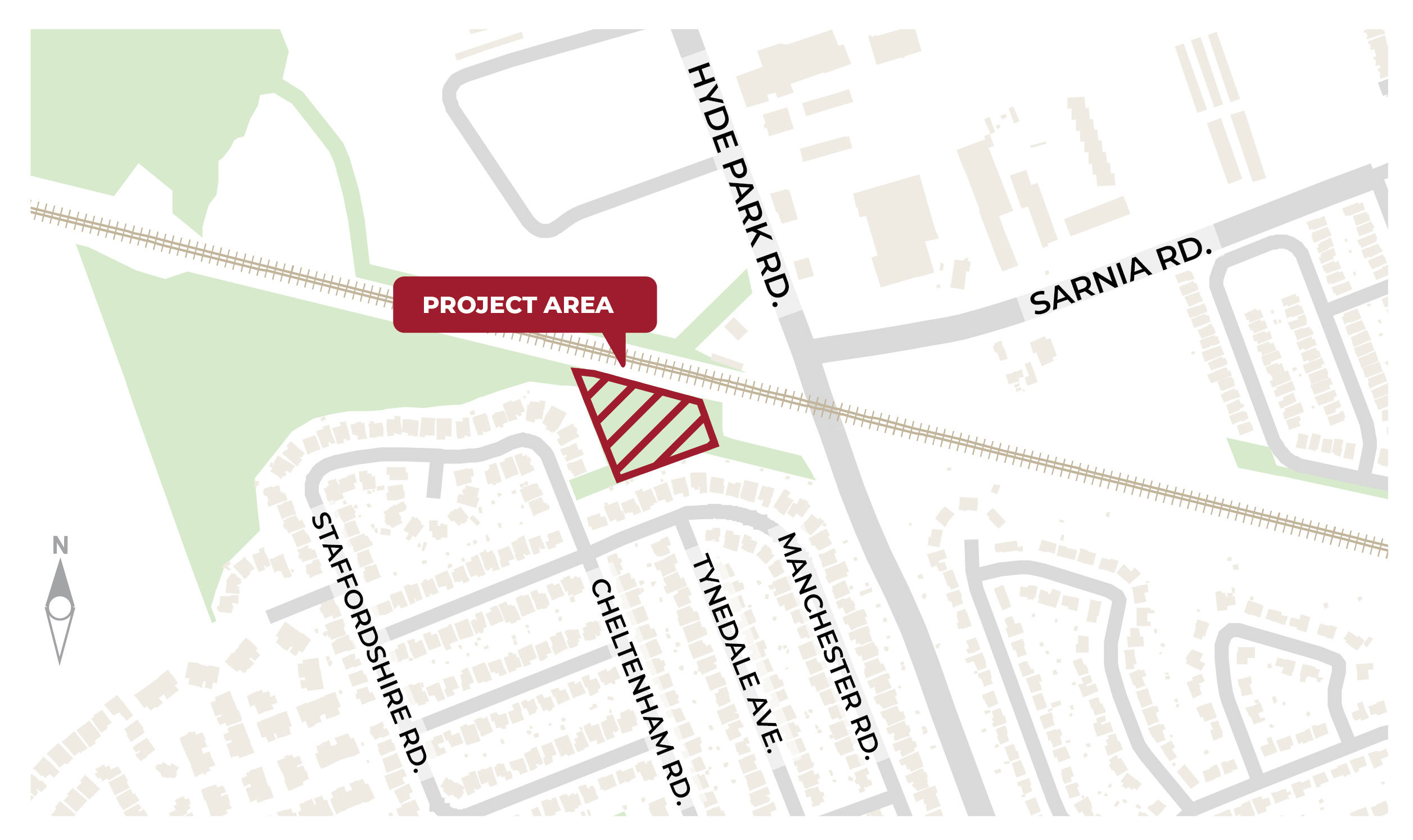 No road closures are anticipated for this project. The pathway between Staffordshire Road and Hyde Park Road may need to be closed for short periods to accommodate construction activities. Residents may notice increased traffic from construction vehicles and elevated noise levels in the area. We apologize for any inconvenience this may cause and appreciate your patience during this work.