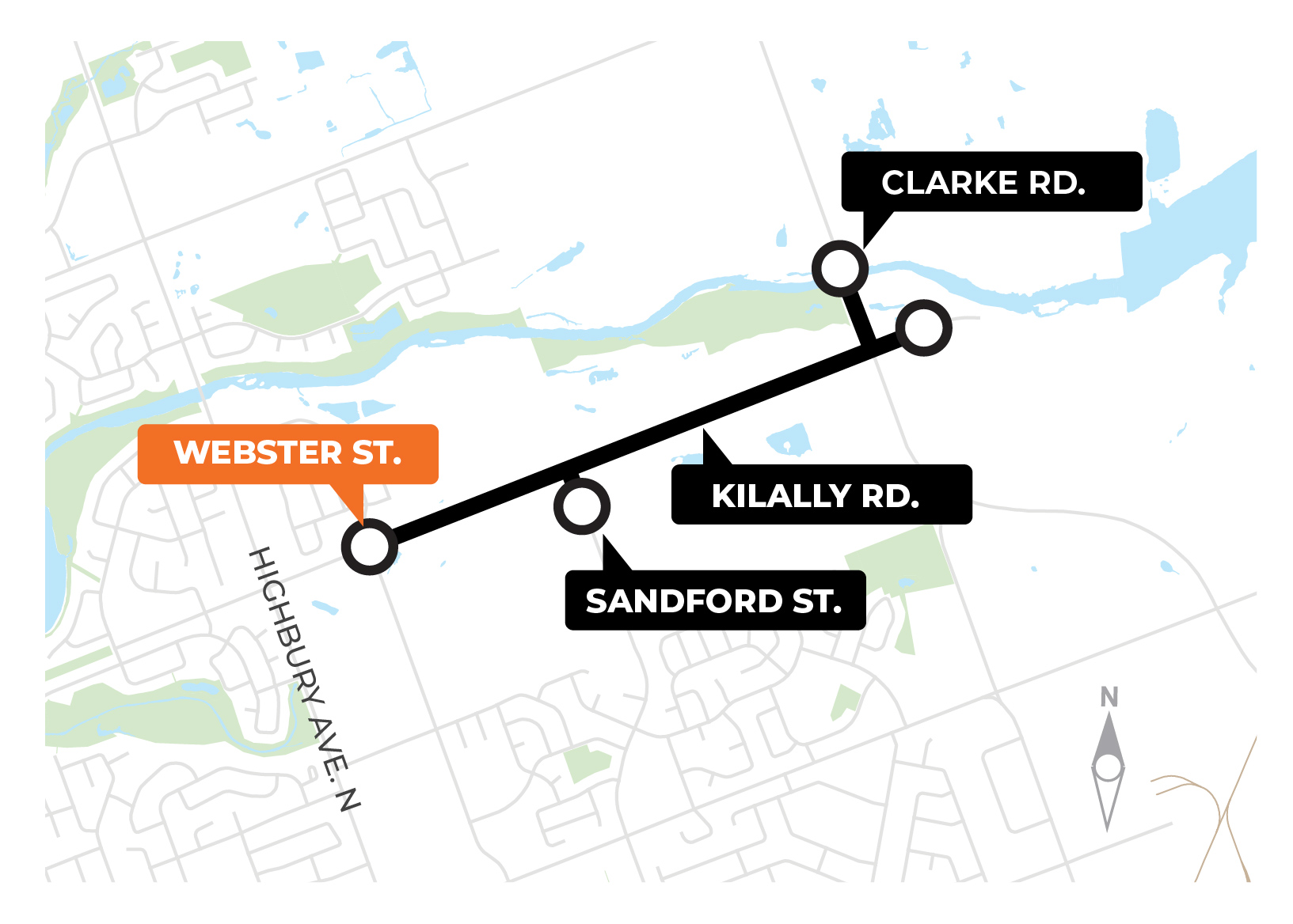 Above: The map shows the project limits. Upgrades are being planned on Kilally Road from Webster Street to Clarke Road.
