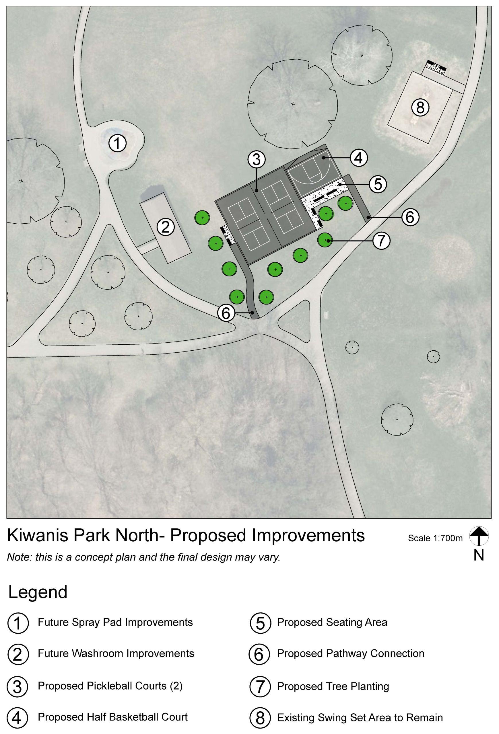 In addition to the work above, future improvements to the existing spray pad and washroom building will occur. A concept map of the proposed enhancements is below. Please note that with the removal of the existing tennis courts in Kiwanis Park - North, the City will be improving and constructing new tennis courts in the surrounding area.