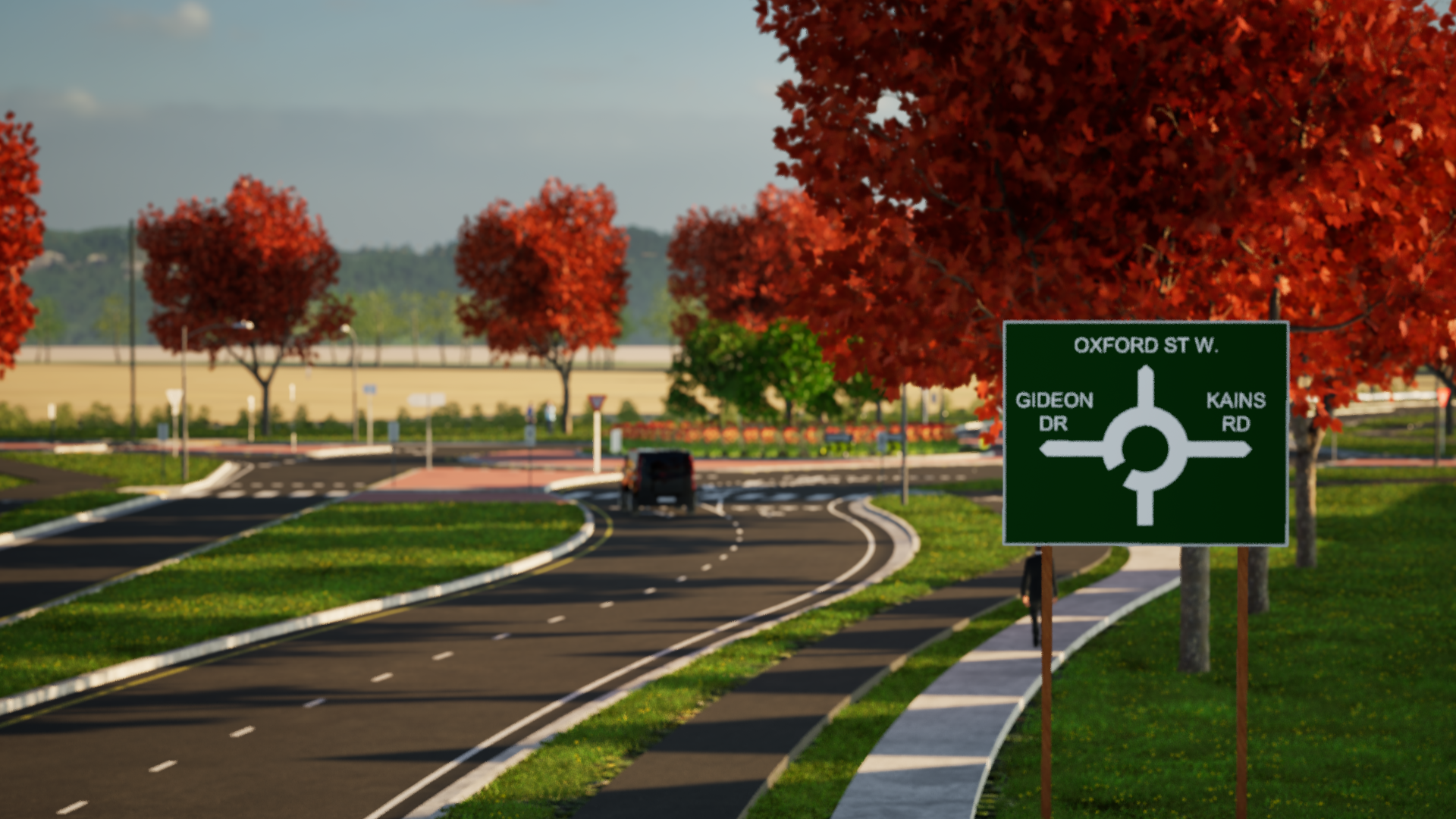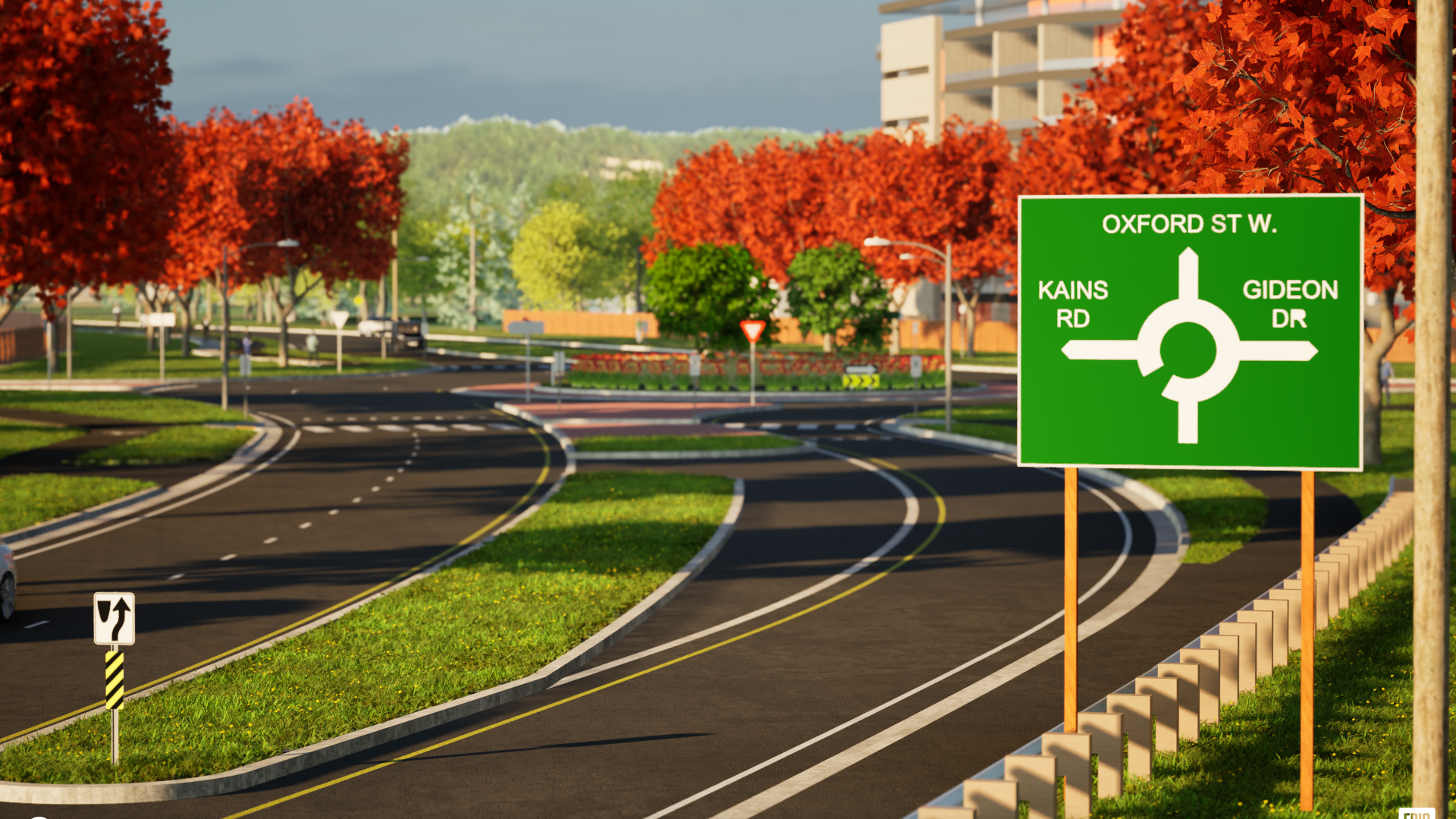 The City is planning to introduce a roundabout at the Oxford Street West and Gideon Drive intersection. The project will add above ground improvements, including cycle tracks and sidewalk, pedestrian crossings, landscaping, and streetlighting, while repairing and replacing underground infrastructure. The video below provides a preview of the roundabout design.