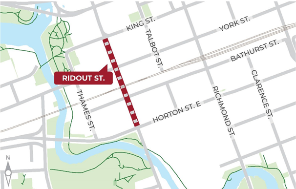 The map below shows the approximate location of the work area along Ridout Street, between Horton Street and King Street.