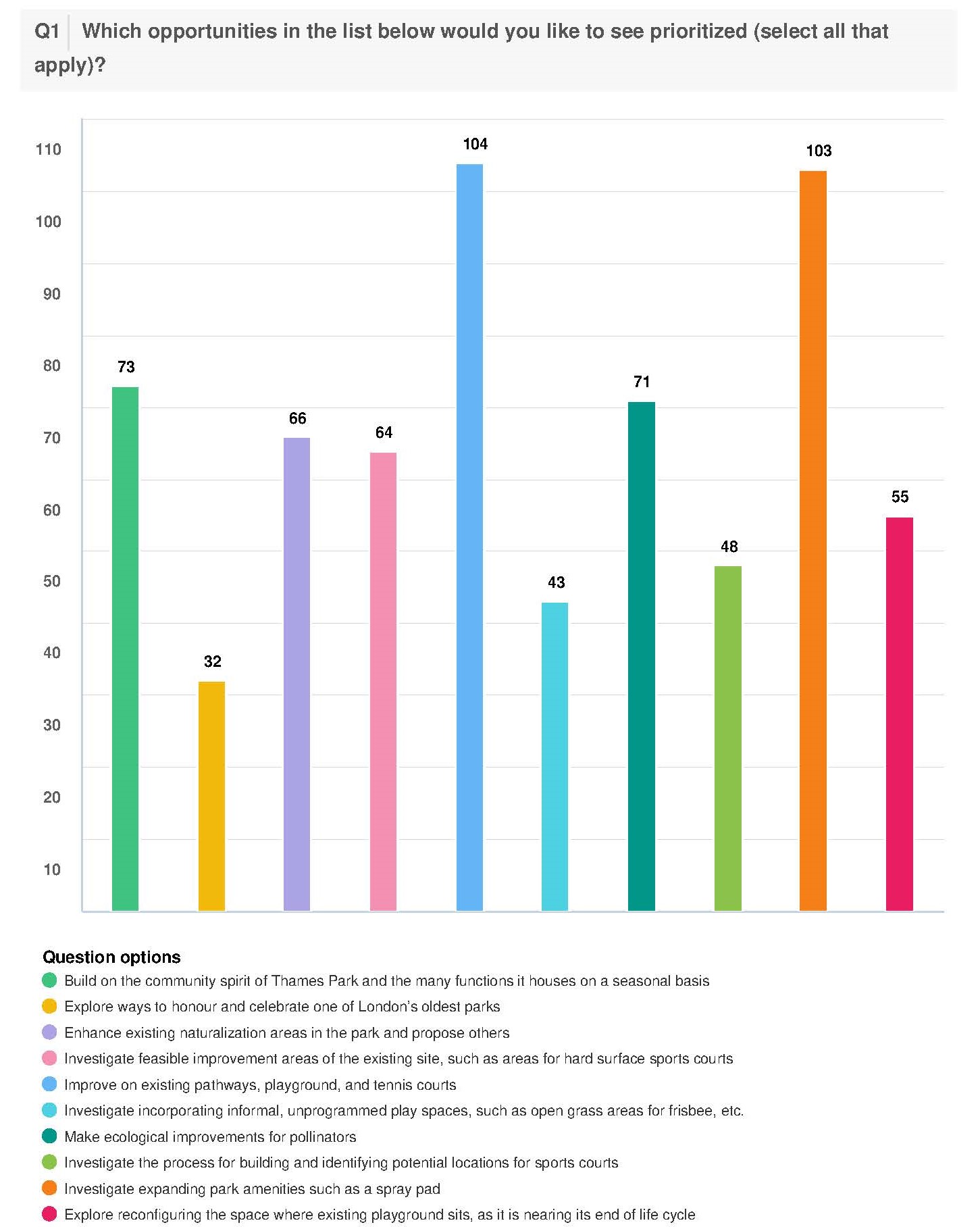 Examples of amenities that may be added at Thames Park include improved pathways, an improved playground, storm water management, pickleball courts, a community events space, naturalization improvements, sports field improvements, improvements for pollinators, and basketball courts, to name a few.