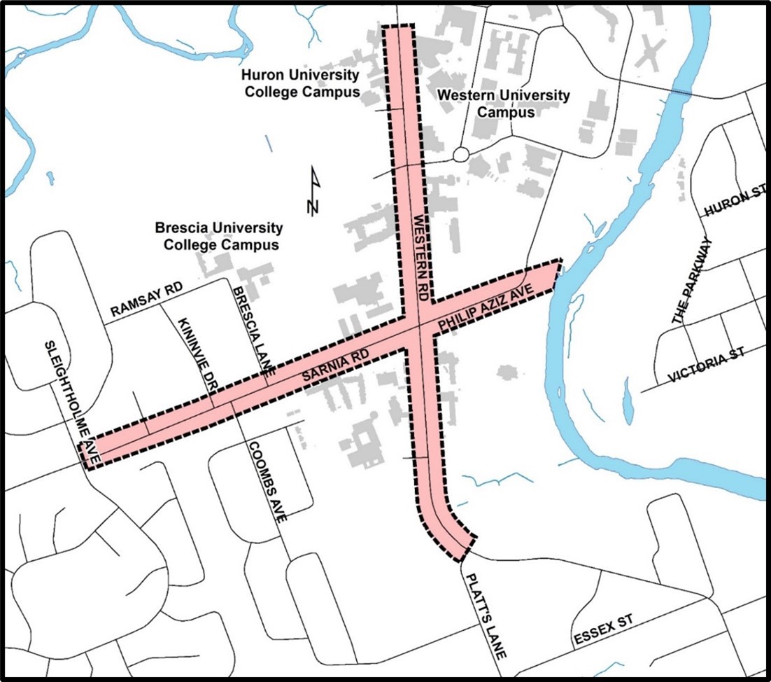 Above: A map showing the approximate project limits of the construction area. Work is planned on Western Road from Platt’s Lane to Burnlea Walk, Philip Aziz Avenue from Western Road to Thames River, and Sarnia Road from Sleightholme Avenue to Western Road.
