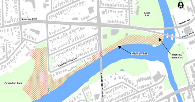 The project will start with an earth berm at Cavendish Park, then change to a reinforced vertical wall near Wharncliffe Avenue Bridge and finally return to an earth berm through Mitchell A. Baran Park to Kensington Bridge.